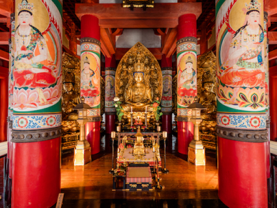Daito was constructed by Kobo Daishi (Kukai) as a center for the study of Shingon (Esoteric) Buddhism. In the center of this tower there is a statue of the "Universal Buddha" Dainichi Nyorai seated in the "Womb Mandala" Taizokai and surrounded by four protector Buddhas from the "Diamond World" Kongokai. This is a unique three-dimensional mandala that is comprised of statues and brilliant paintings covering both the tower's walls and its 16 massive columns.