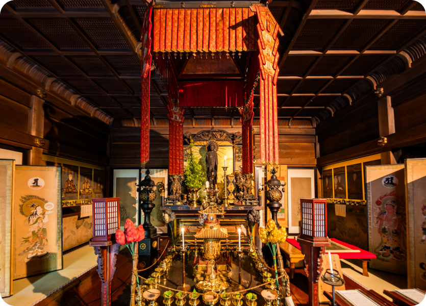 拝観受付を済ませた後、まず大広間に進み、奥の持仏間にお祀りされている持仏ご本尊、弘法大師坐像に参拝しましょう。ご本尊は秘仏ですので厨子に向かって拝礼します。