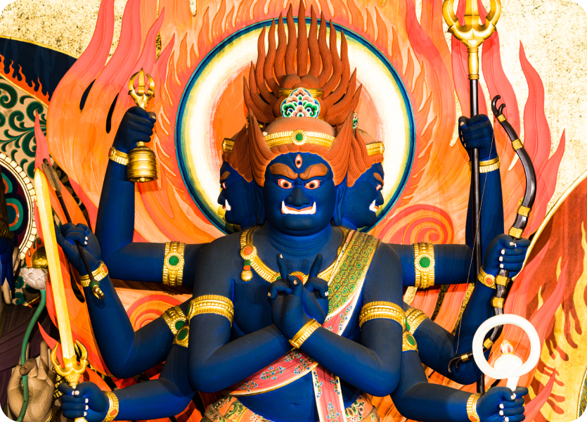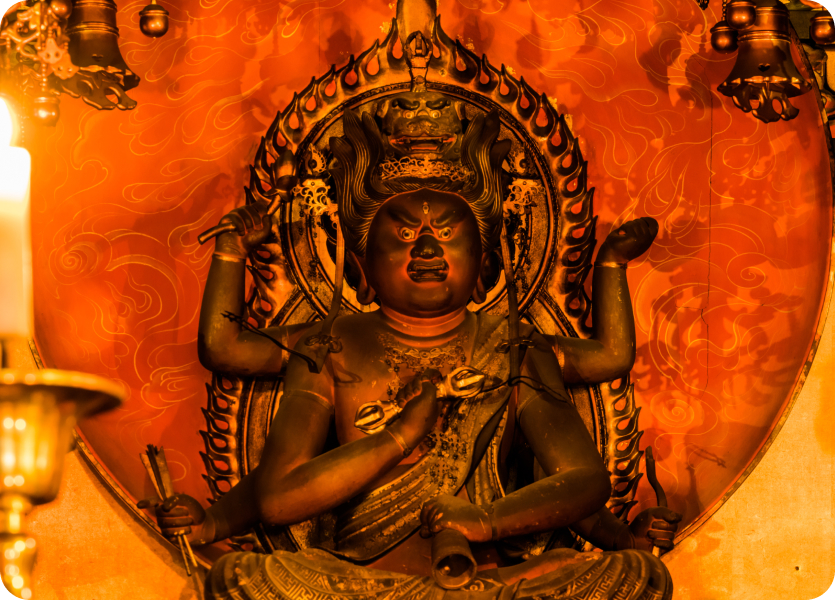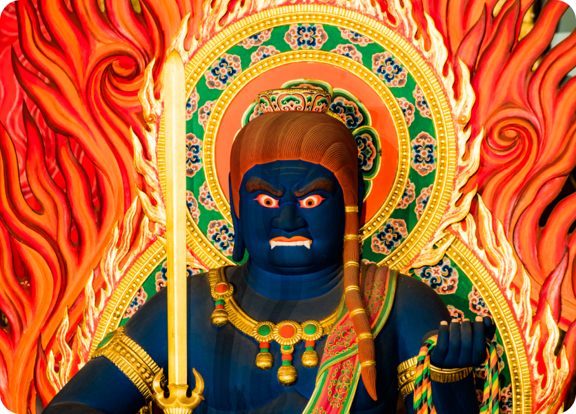 五大明王の一尊で中心的な存在。右手には剣を、左手には説法を聞かない者を縛る縄を持ちます。真言は「ノウマク サンマンダ バザラ ダン センダ マカロ シャダ ソワタヤ ウン タラタ カンマン」