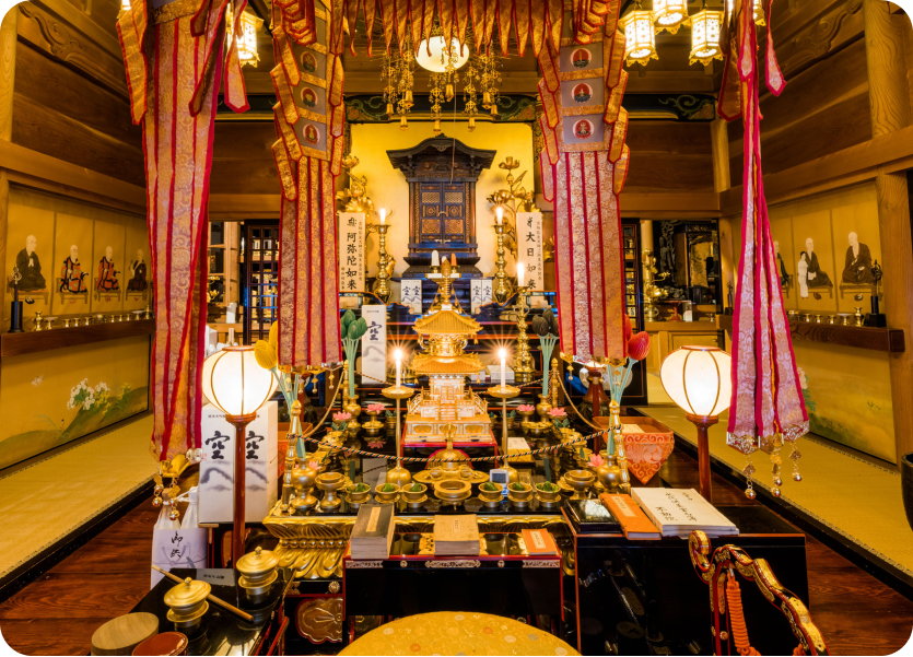 灌頂造りの荘厳な本堂には金剛界大日如来を中心に、脇侍として不動明王と愛染明王をお祀りしています。大日如来像は重要文化財で、高野山霊宝館に安置されています。