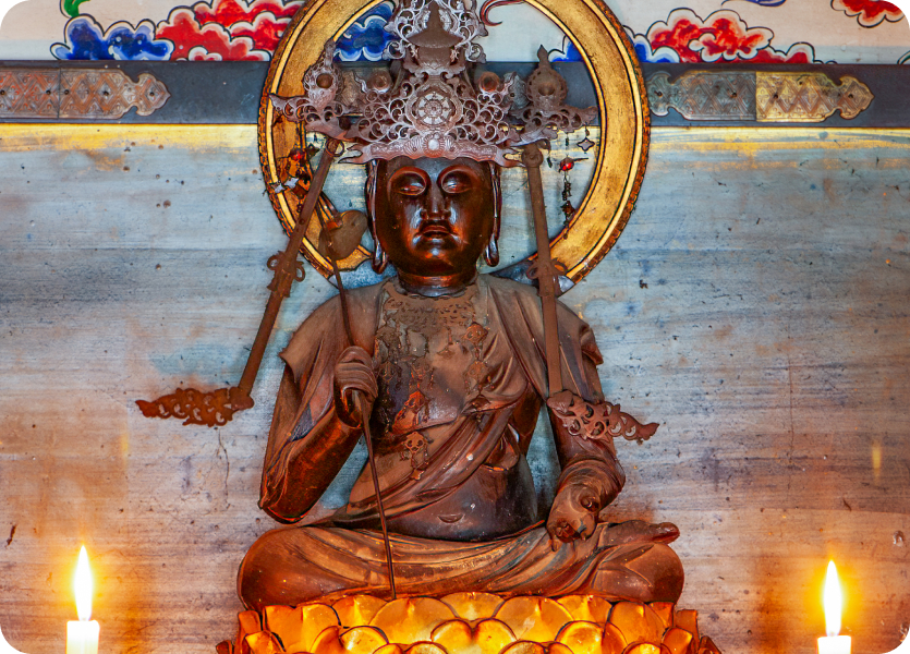 炎を背負い、激しい怒りの形相で人を救い導く仏様。「お不動さん」の名で親しまれています。五大明王の一尊で密教では中心的な仏です。当院の不動明王は秘仏ですが、弘法大師空海による彫像と伝わります。