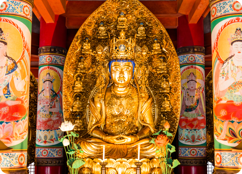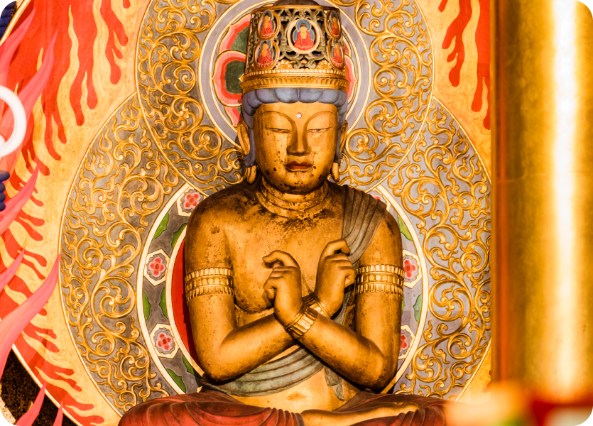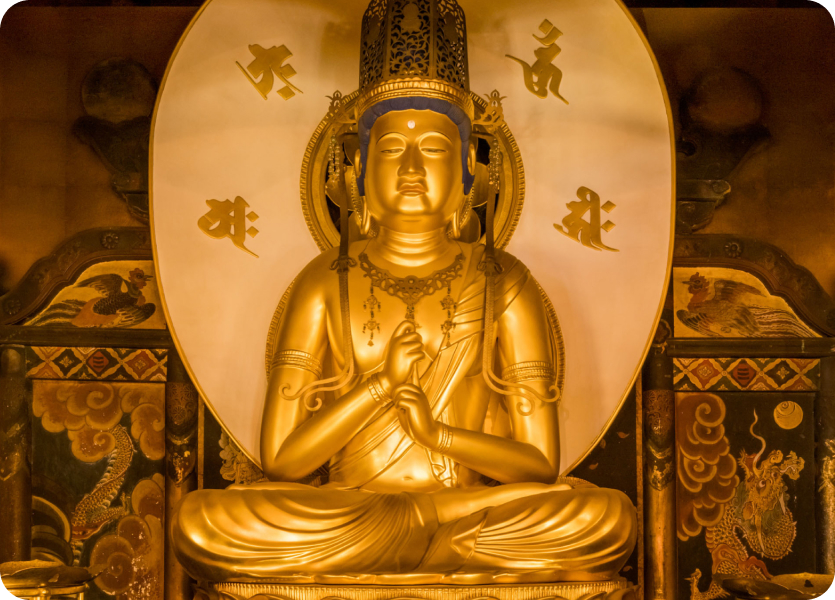 宇宙の真理を仏格化した密教の根本的な仏様。智恵の光明は一切を照らし、慈悲の心は永遠に不滅といわれています。真言は「アビラウンケン」