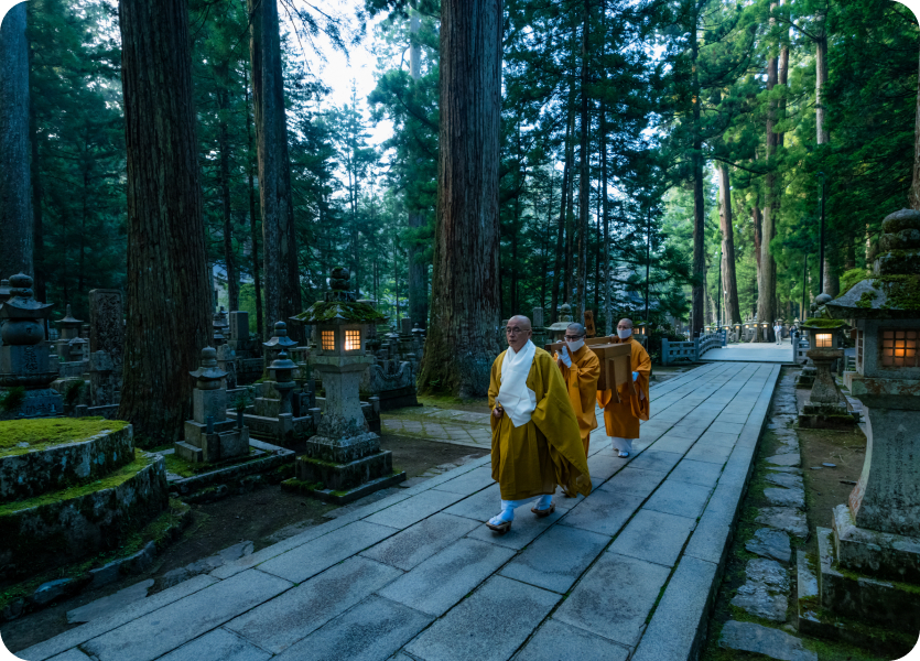 御廟では弘法大師が今も深い瞑想を続け、人々を救済し続けているという信仰があります。そのためお大師さまに二度のお食事をお供えする「生身供(しょうじんく)」がおよそ1200年もの間、毎日続けられています。