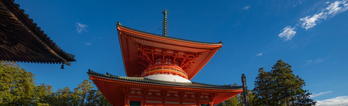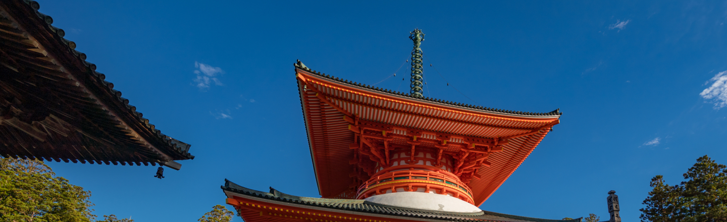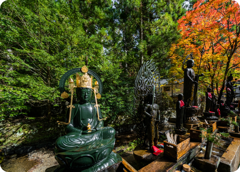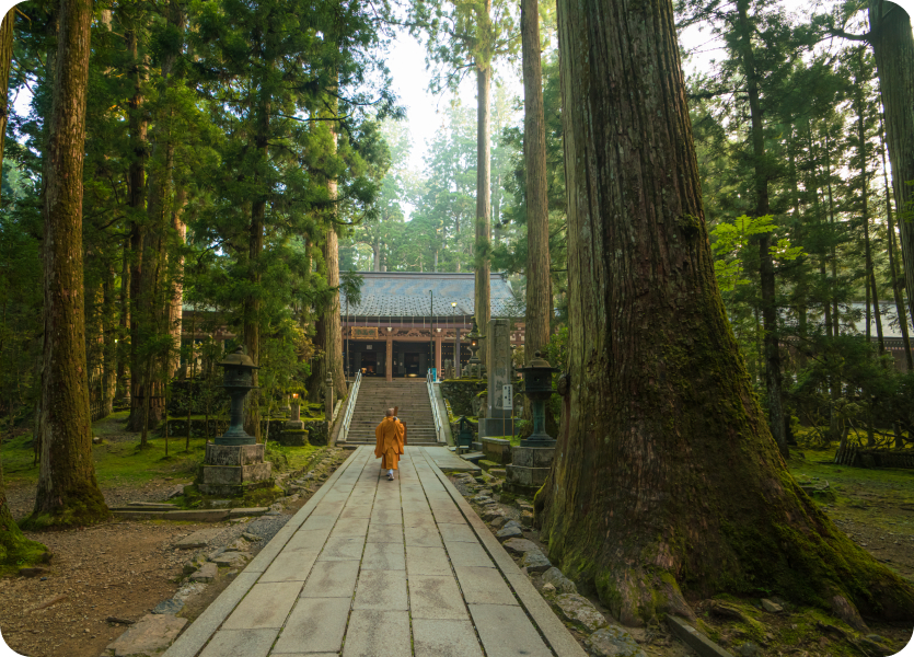 高野山は主に3つのエリア、「壇上伽藍」「金剛峯寺」「奥之院」に分かれます。「壇上伽藍」は弘法大師空海が開いた真言密教の根本道場。お堂が立ち並び、多くの仏様が祀られています。「金剛峯寺」は高野山真言宗の総本山で、儀式や法会が行われます。「奥之院」は弘法大師信仰の中心地。お大師さまを祀る御廟へと続く参道は千年杉に覆われ、多くの供養塔が立ち並びます。