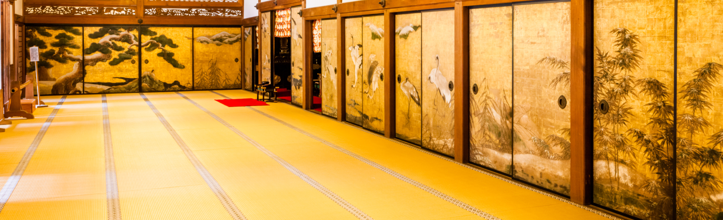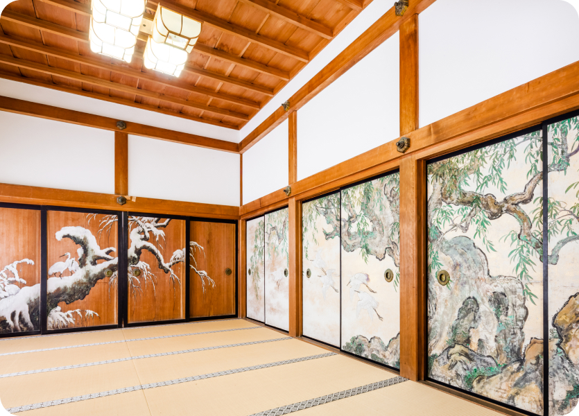 松と鶴のふすま絵に彩られた大広間、その正面奥に持仏間があり、ご本尊として弘法大師坐像(秘仏)をお祀りしています。大師坐像は延宝8年(1680)、検校(けんぎょう)文啓の指示で製作されました。両側には梵天(ぼんてん)・帝釈天(たいしゃくてん)、それを囲むように歴代天皇の御尊儀(位牌)や歴代座主の位牌が祀られています。大広間では重要な儀式や法会が行われます。松と鶴のふすま絵は雪舟四代目の雲谷等益(うんこくとうえき)の同門、斉藤等室(さいとうとうしつ)の筆。広間に続く梅の間にも、同絵師による梅月流水(ばいげつりゅうすい)と呼ばれるふすま絵があります。