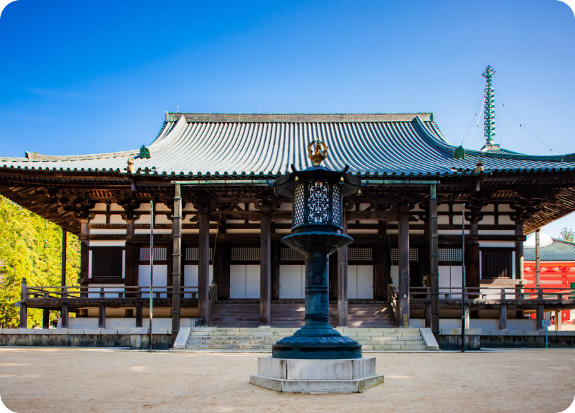 伽藍の中央にある高野山一山の総本堂。高野山の主な行事が執り行われます。弘法大師空海により弘仁10年(819)に建立、当初は講堂と呼ばれていました。現在の建物は7度焼失し、昭和7年(1932)に再建されたもの。ご本尊は高村光雲作の阿閦如来(あしゅくにょらい)(一説には薬師如来)で秘仏です。ご本尊を守る脇侍(きょうじ)仏として、不動明王(ふどうみょうおう)、普賢延命菩薩(ふげんえんめいぼさつ)、虚空蔵菩薩(こくうぞうぼさつ)など諸尊が並びます。左右には「両界曼荼羅(りょうかいまんだら)」(*1)が掲げられ、平清盛が自らの額を割った血を混ぜて描かせたことから「血曼荼羅(ちまんだら)」とも呼ばれています(本物は霊宝館にあり、こちらはレプリカです)。 平成27年(2015)、高野山開創千二百年を記念して史上初となるご本尊の特別開帳が行われました。