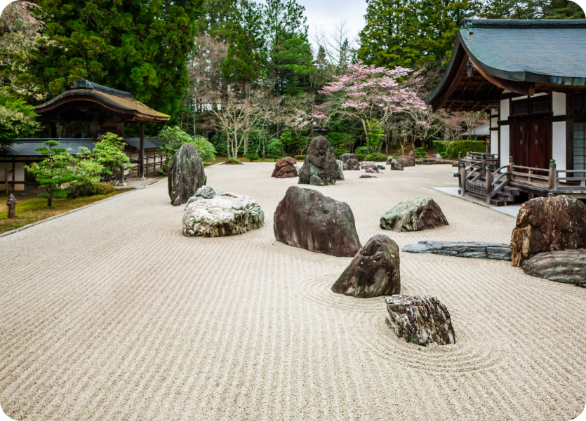 2,340㎡(約707坪)の日本最大級の石庭です。蟠龍とは、まだ天に昇らず、地(高野山)にとどまっている龍のこと。京都の白川砂を敷き詰め雲海に見立て、弘法大師生誕の地、四国の青い花崗岩140個を用いて龍を表しています。雲海の中で雄雌一対の龍が向かい合い、頭を持ち上げて勅使(ちょくし)門より入る人を招き、貴賓室である奥殿を囲み守っているように表現されています。
